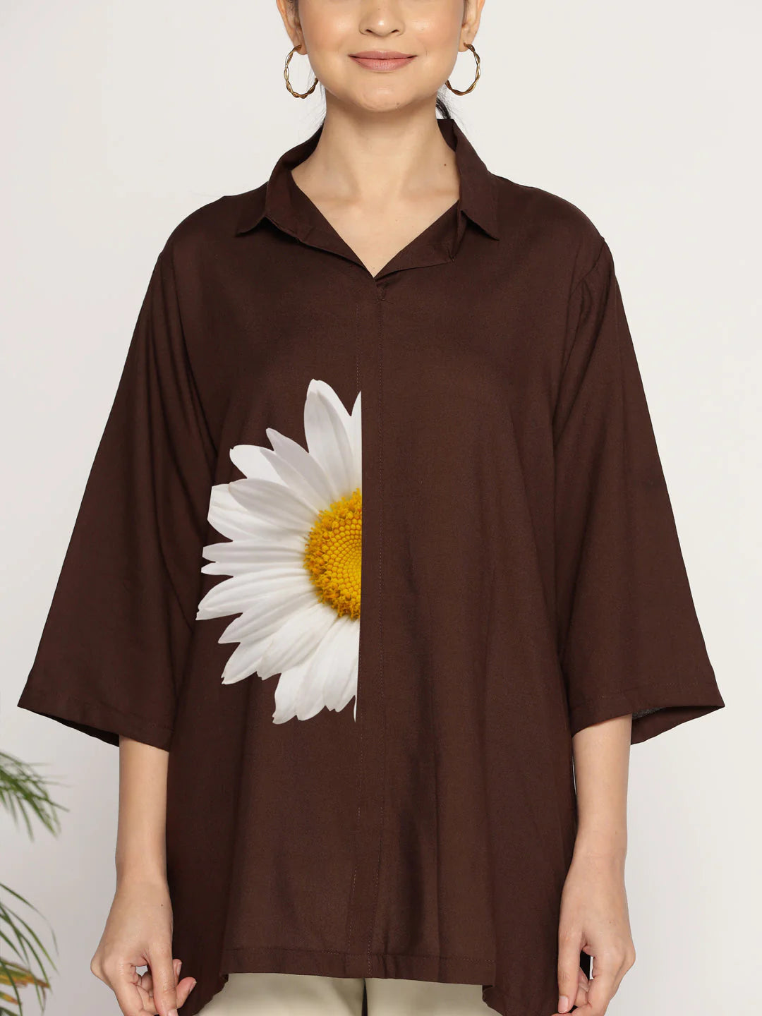 Introducing the Coffee Rayon ShirtTop - Parfum, your new summer essential! Made from luxurious rayon fabric with 3/4th length sleeves, it offers both comfort and style. With its classic shirt-style design and collar details, this versatile top pairs perfectly with anything from tailored trousers to denim skirts. Available in sizes XS to 8XL, it's tailored to flatter every body type. Embrace effortless chic in coffee with Parfum!