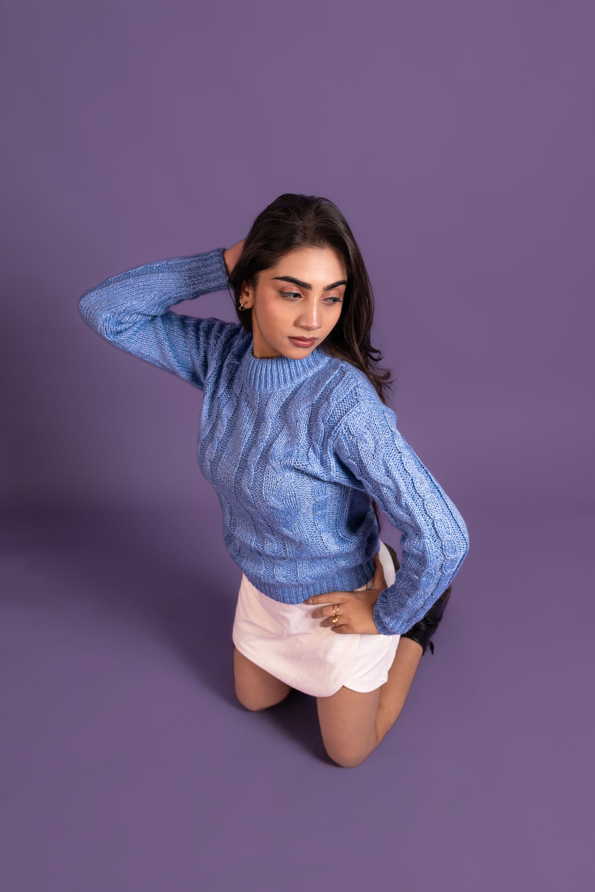 A soft blue cable-knit sweater designed to bring subtle colour and texture into your winter wardrobe. The classic knit pattern adds depth without feeling heavy, making it an easy choice for everyday dressing across Indian winters.