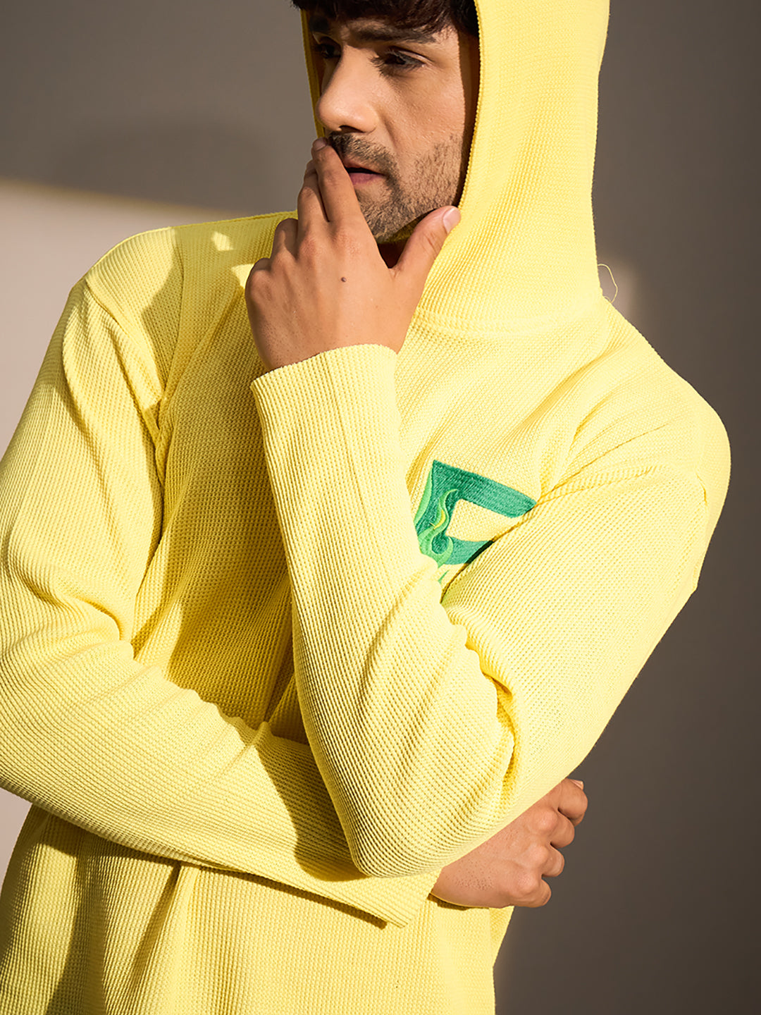 Add a pop of color to your everyday look with this Lemon Waffle Hoodie. Crafted from soft cotton waffle knit, it’s breathable, stylish, and perfect for year-round comfort.
